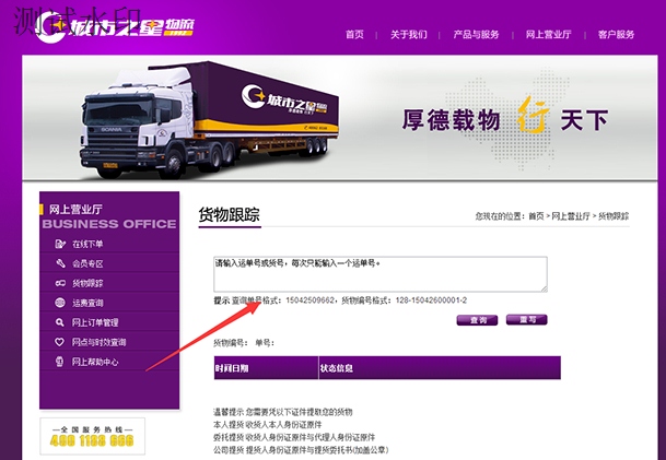 步驟2:進(jìn)入官網(wǎng)后點(diǎn)擊右上方的“網(wǎng)上營(yíng)業(yè)廳”下面的“貨物跟蹤”進(jìn)入查詢頁(yè)面,如下圖: